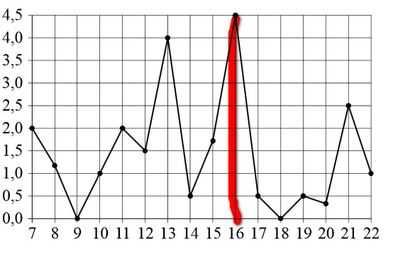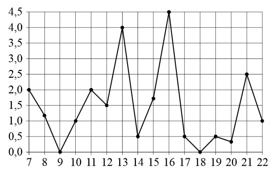 На рисунке жирными точками показано суточное количество осадков, выпадавших в Мурманске с 7 по 22 ноября 1995 года. По горизонтали указываются числа месяца, по вертикали — количество осадков, выпавших в соответствующий день, в миллиметрах. Для наглядности жирные точки на рисунке соединены линией. Определите по рисунку наибольшее суточное количество осадков за данный период. Ответ дайте в миллиметрах
