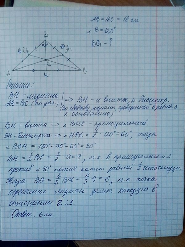 Медианы AA1 и CC1 треугольника ABC, в котором угол B равен 120º, пересекаются в точке G. Найдите BG, если AB = BC = 18 см.