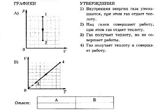 На рисунках А и Б приведены графики двух процессов: 1–2 и 3–4, каждый из которых совершается одним молем аргона. Графики построены в координатах p–V и р–Т, где р — давление, V — объем и Т — абсолютная температура газа. Установите соответствие между графиками и утверждениями, характеризующими изображенные на графиках процессы.