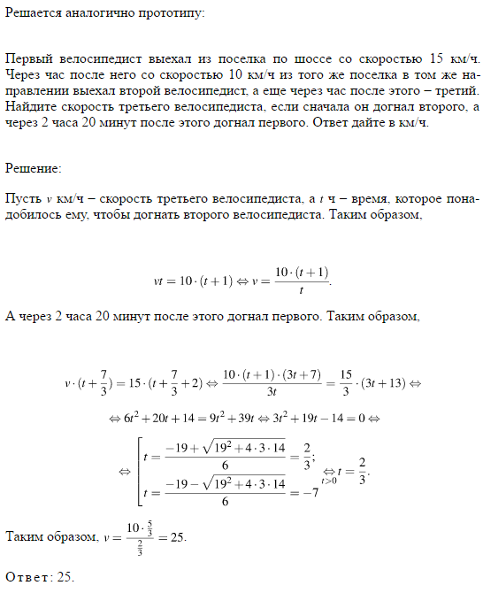 Первый велосипедист выехал из поселка со скоростью 17 километров час. Через час после него со скоростью 13 километров в час из того же поселка в том же направлении выехал второй велосипедист, a через час после этого - третий. Найдите скорость третьего велосипедиста если сначала он догнал второго, а через 3 часа 10 минут после этого догнал первого. Ответ дайте в километрах час.