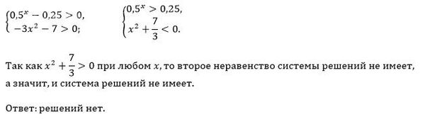 [m]\frac{0,5^{x}-0,25}{3x^2+7}<0[/m] - дробь отрицательна, когда числитель и знаменатель имеют разные знаки,