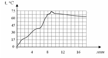 На графике показан процесс разогрева двигателя легкового автомобиля при температуре окружающего воздуха 5°С. На оси абсцисс откладывается время в минутах, прошедшее от запуска двигателя, на оси ординат - температура двигателя в градусах Цельсия. Когда температура достигает определённого значения, включается вентилятор, охлаждающий двигатель, и температура начинает понижаться. Определите по графику, сколько минут прошло с момента запуска двигателя до включения вентилятора?