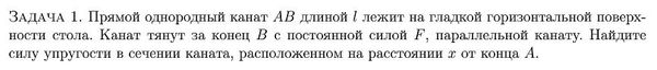 Прямой однородный канат АВ длиной l лежит на гладкой горизонтальной поверхности стола. Канат тянут за конец В с постоянной силой F, параллельной канату. Найдите силу упругости в сечении каната, расположенном на расстоянии x от конца А.