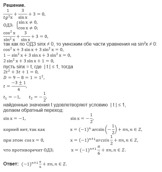Решить уравнение 1/tg^2x+3/sinx+3=0