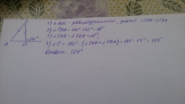 угол B = 180-152 = 26, треугольник ABC равнобедренный => угол A = 26. Сумма углов треугольника = 180 градусов => 180-2*26=124 градуса Ответ: 124 гр.