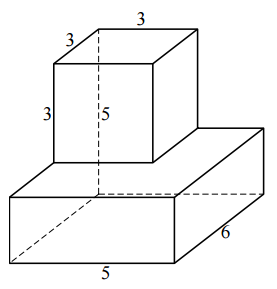 Пере прямоугольный параллелепипед внизу и куб вверху. Общую площадь фигуры найдем как сумму двух, из которых она состоит. S1 = 5*6*(5-3) = 60 S2 = 3^3 = 27 Sобщая = 60+27 = 87 Ответ: 87