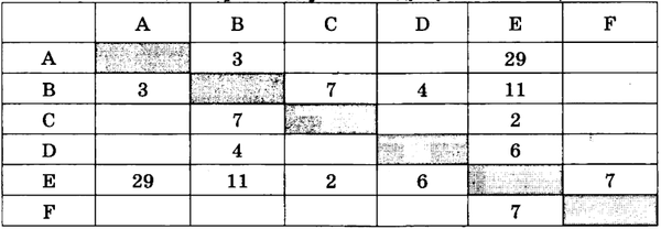 Определите длину кратчайшего пути между пунктами А и F (при условии, что передвигаться можно только по построенным дорогам).