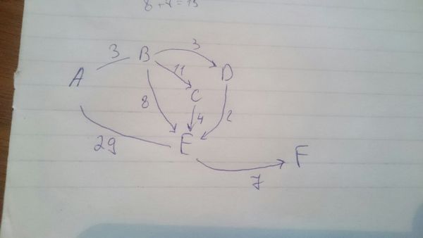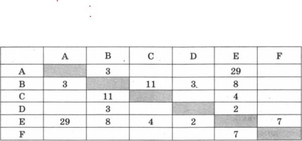 Между населенными пунктами А,B,C,D,E,F построены дороги, протяженность которых приведена в таблице(отсутствие числа означает, что прямой дороги нет). Определите длину кратчайшего пути из A в F, если передвигаться можно только по построенным дорогам.