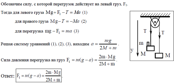 К концам невесомой и нерастяжимой нити, перекинутой через невесомый блок, подвешены два груза массы М каждый. На один из грузов положен перегрузок массы m . Найдите силу, с которой перегрузок давит на груз. Силами трения пренебречь.