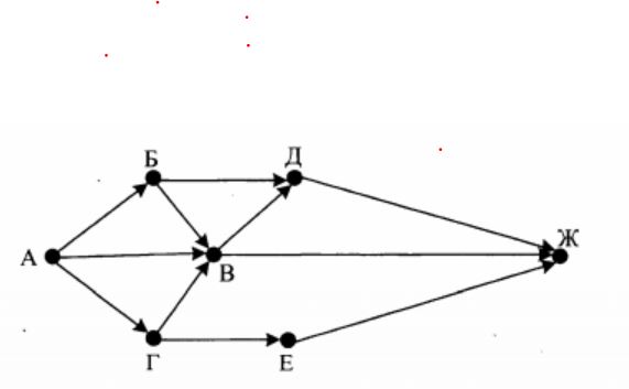 На рисунке - схема дорог, связывающих города А,Б,В,Г,Д,Е,Ж. По каждой дороге можно двигаться только в 1 направлении, указанном стрелкой. Сколько существует различных путей из А в Ж?