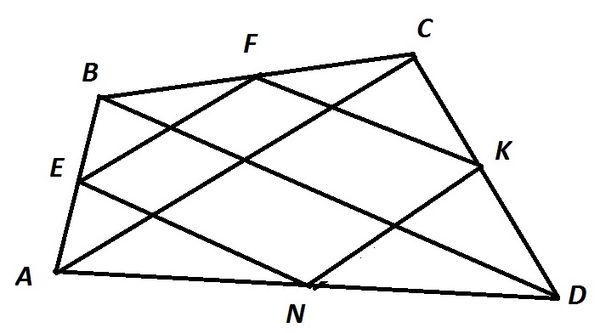 ABCD — произвольный четырёхугольник, а точки Е, F, К, N — середины его сторон, последовательно соединённые. Докажите, что полученный четырёхугольник EFKN — параллелограмм.