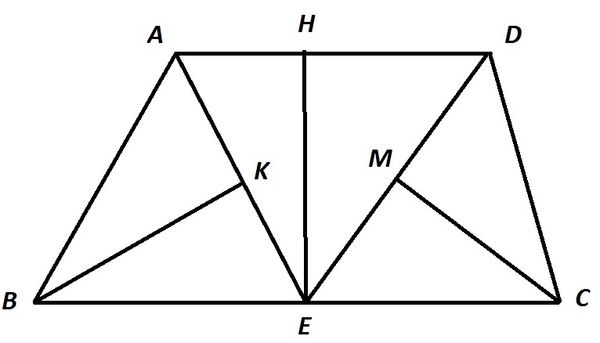 В трапеции ABCD биссектрисы тупых углов при основании AD пересекаются в точке Е, принадлежащей другому основанию, АЕ = 3, DE = 2,6. Найдите основания трапеции, если высота трапеции равна 2,4.
