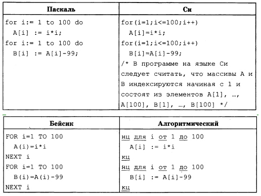 В первом цикле, в массиве A, квадраты чисел от 1 до 100, то есть: 1, 4, 9, 16 и тд.