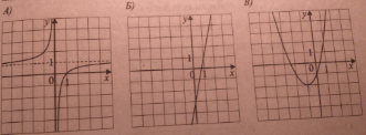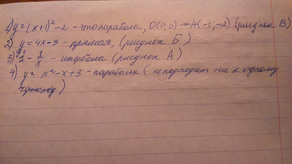 Установите соответствие между графиками функций и формулами, которые их задают. 1)y=(x+1)^2-2 2)y=4x-3 3)1-1/x 4)y=x^2-x+3