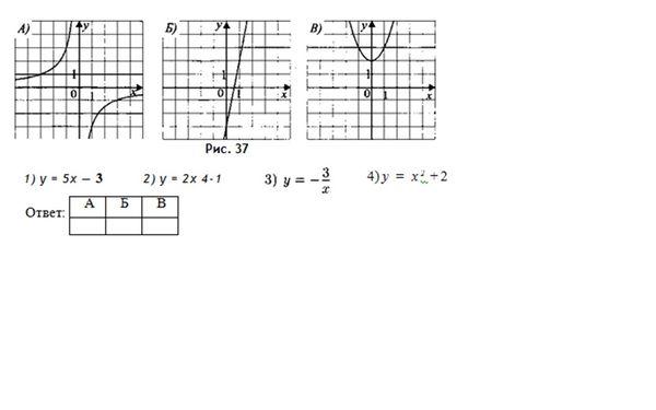 Установите соответствие между графиками функций (см. рис. 37) и формулами, которые их задают.