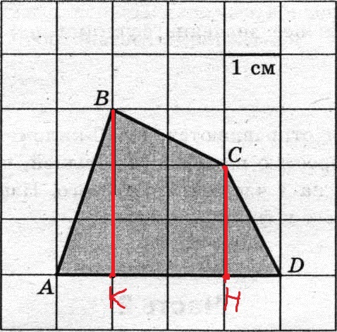 Делим этот четырехугольника ABCD на разные фигуры: прямоугольный треугольник ABK, трапецию BCHK, прямоугольный треугольник CHB. И найдем их площади.