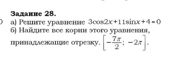 а) Решите уравнение 3cos2x+11sinx+4=0 б) Найдите все корни этого уравнения, принадлежащие отрезку. [-7π/2; -2π].