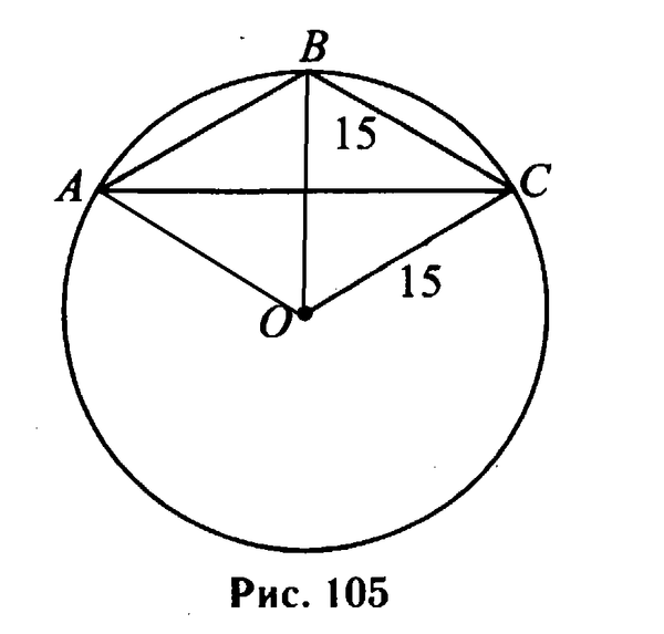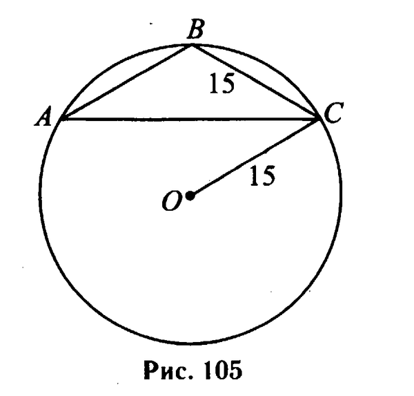 Около равнобедренного треугольника АВС с боковой стороной, равной 15, описана окружность, радиус которой 15 (см. рис. 105). Найдите угол (в градусах) при основании этого треугольника.