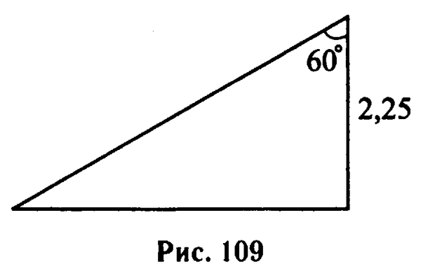 Согласно техническим условиям, верхний край лестницы, приставляемой к стене, совпадает с верхним краем стены, высота которой 2,25 м. Угол между лестницей и стеной 60° (см. рис. 109). Какова должна быть длина (в см) приставляемой лестницы?