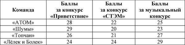 Для каждой команды баллы по всем конкурсам суммируются, победителем считается команда, набравшая в сумме наибольшее количество баллов. Какое место заняла команда «Шумы»?