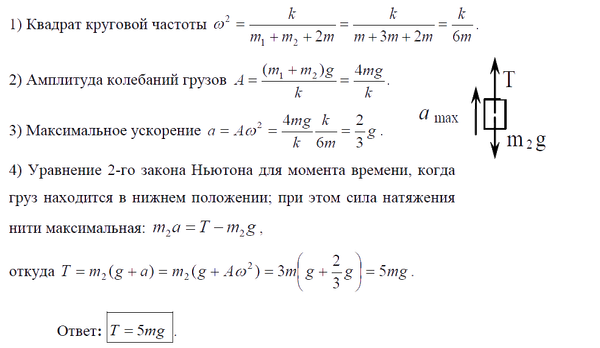 К оси колеса, масса m которого равномерно распределена по ободу, присоединена пружина жесткости k. Второй конец пружины прикреплен к стене. С помощью нити, перекинутой через блок, к оси колеса подвешены два груза: m1=m, и m2=3m. Система пришла в движение с нулевой начальной скоростью при недеформированной пружине. Считая, что колесо катится по горизонтальной поверхности без проскальзывания, определите максимальную силу натяжения нити, соединяющей грузы m1 и m2, при их дальнейшем движении. Массами пружины, нити и блока пренебречь.