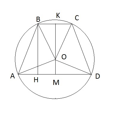 Проведем Высоту ВН. Из прямоугольного треугольника АВН найдем высоту ВН по теореме Пифагора: ВН^2=FD^2-AH^2. АН =(8-2)/2=3. BH^2=25-9 => BH=4, MK=BH=4. Треугольник АОD равнобедренный, АО=OD как радиусы. ОМ является высотой и медианой. AO^2=OM^2+AM^2, AO=R => R^2=OM^2+AM^2 => R^2=OM^2+16. Треугольник ВОС равнобедренный, ВО=ОС как радиусы, ОК является медианой и высотой => R^2= OK^2+BK^2. OK=4-OM => R^2=1+(4-OM)^2 => OM^2+4=1+(4-OM)^2 => 16+OM^2=1+16-8OM+OM^2 => 8OM=1 => OM=1/8. OK=4-1/8=31/8