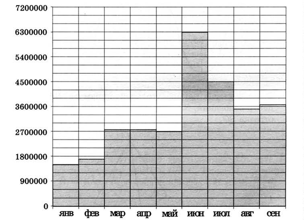 На диаграмме показано число запросов со словом ФУТБОЛ, сделанных на некотором поисковом сайте во все месяцы с января по сентябрь 2010 года. По горизонтали указываются месяцы, по вертикали — число запросов за данный месяц. Определите по диаграмме, сколько было месяцев в указанный период, когда число запросов со словом ФУТБОЛ было меньше 3 600 000.