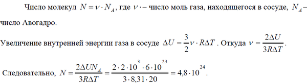 Сколько молекул гелия N было в закрытом сосуде, если при нагревании на ?t=20 С внутренняя энергия газа увеличилась на U = 2 кДж? Газ считать идеальным.