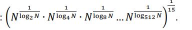 [m] N^{\frac{1}{\log_2 N}} \cdot N^{\frac{1}{\log_4 N}} \cdot N^{\frac{1}{\log_8 N}} \ldots N^{\frac{1}{\log_{512} N}} [/m]^{\frac{1}{15}}.