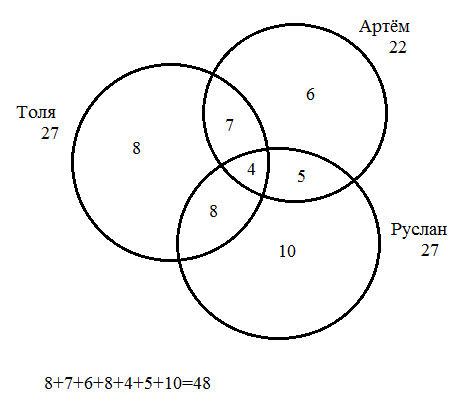 12 книг прочитали Толя и Руслан, из них 4 книги прочитали трое,