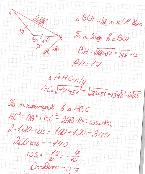 Рассмотрим треугольник ВСН. По теореме Пифагора ВН2 = 100 - 51 = 49, следовательно ВН = 7. Косинус тупого угла отрицательный поэтому он равен - ВН : ВС = -7:10 = -0,7
