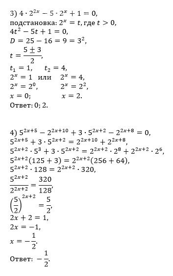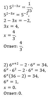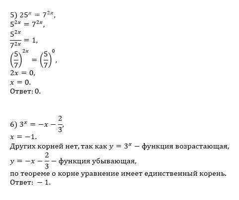 Решите уравнения. 1. 5^(2-3x) = 1/25; 2. 6^(x+2) - 2·6^x = 34; 3. 4·2^(2x) - 5·2^x + 1 = 0; 4. 5^(2x+5) - 2^(2x+10) + 3·5^(2x+2) - 2^(2x+8) = 0; 5. 25^x = 7·2^x; 6. 3^x = -x - 2/3.