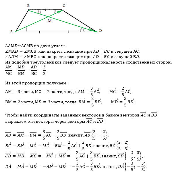 В трапеции ABCD основания AD и BC находятся в отношении 3:2. Приняв векторы AC и BD за базисные, найдите координаты векторов AB, BC, CD, DA в этой системе координат.