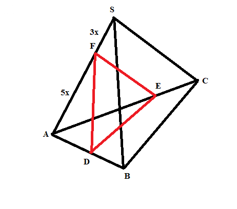 Объем нашей пирамиды SABC будет в 8^3/5^3 = 512/125 раз больше, чем объем этой пирамиды с сечением ADEF.
