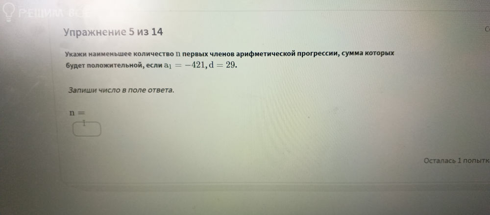 Укажите наименьшее количество n первых членов арифметической прогрессии, сумма которых будет положительной, если a1=-421, d=29