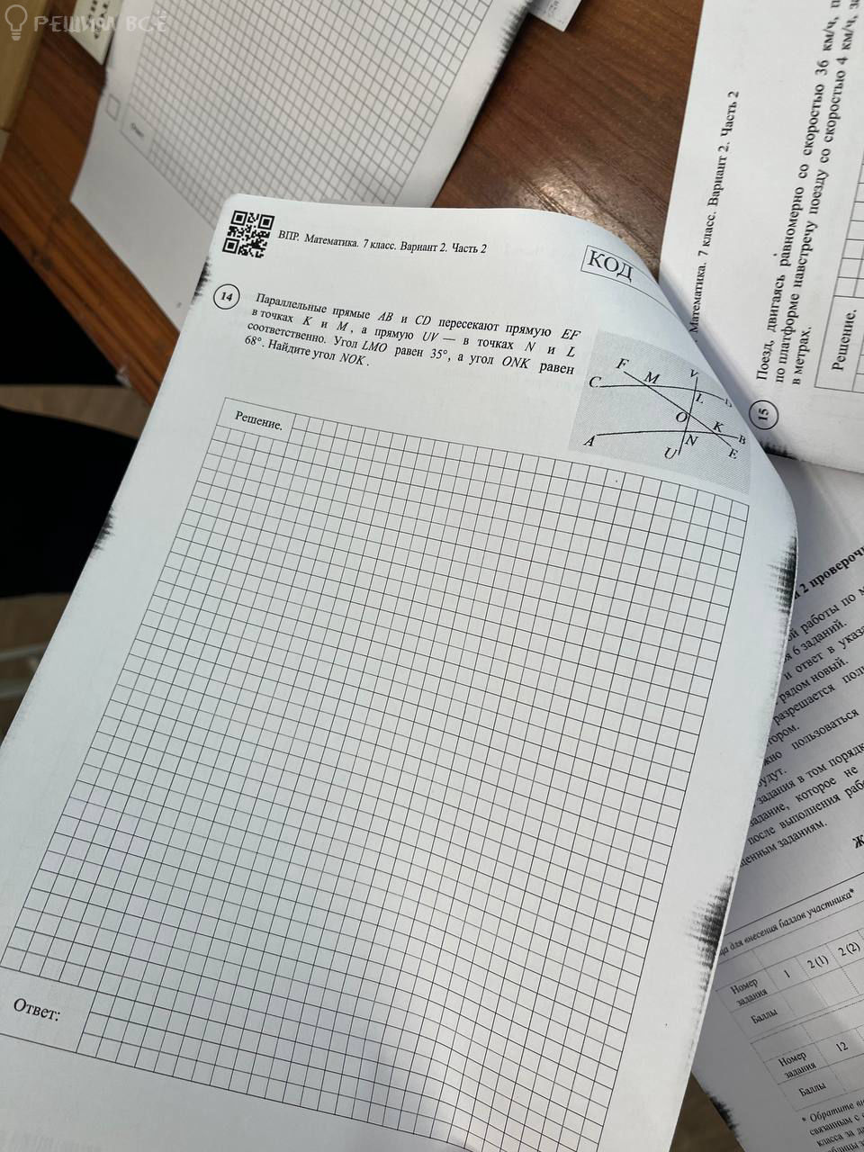 Параллельные прямые AB и CD пересекают прямую EF в точках K и M , а прямую U -в точках N и L соответственно. Угол LMAO равен 35°, а угол ONK равен 68°. Найдите угол NOK.