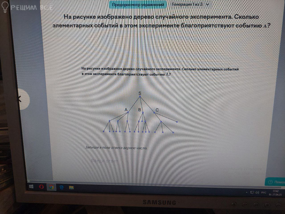 На рисунке изображено дерево случайного эксперимента. Сколько элементарных событий в этом эксперименте благоприятствуют событию А?