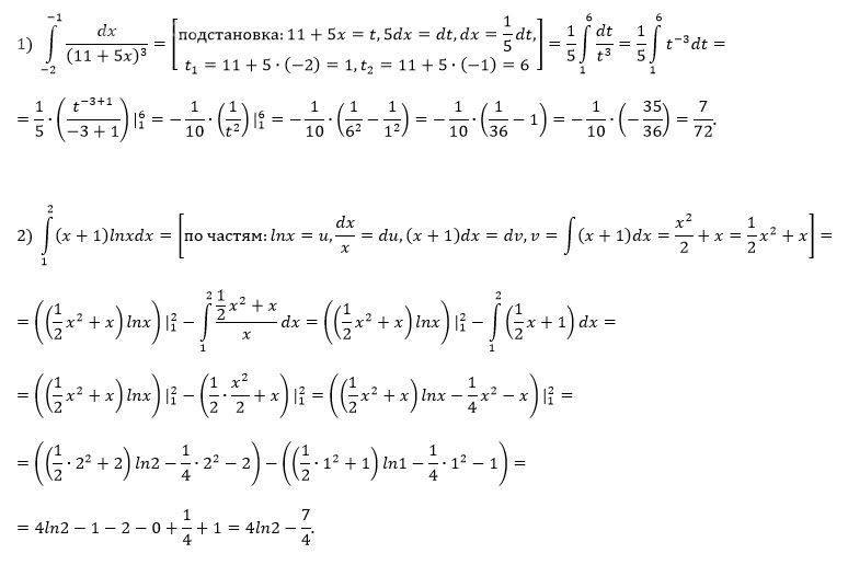 ∫ from -2 to -1 (dx / (11 + 5x)^3), ∫ from 1 to 2 ((x + 1) ln x dx)