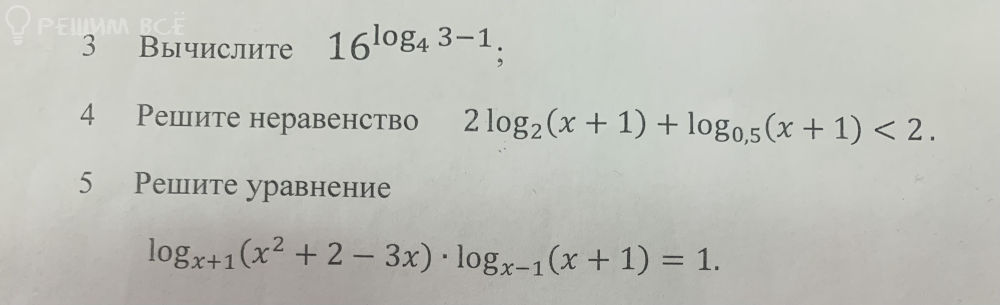 Вычислите 16^(log43-1) Решите неравенство 2log2(x+1) + log(0,5)(x+1) < 2 Решите уравнение log(x+1)(x^2+2-3x)*log(x-1)(x+1) = 1