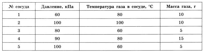 20) Необходимо на опыте обнаружить зависимость объёма газа, находящегося в сосуде под подвижным поршнем, от внешнего давления. Имеются пять различных сосудов с манометрами. Сосуды наполнены одним и тем же газом при различных температурах и давлениях (см. таблицу). Какие два сосуда необходимо взять ученику, чтобы провести данное исследование?