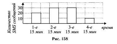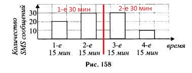 На диаграмме (см. рис. 158) показано количество SMS, переданных слушателями за каждые 15 минут часового эфира программы «Хочу всё знать». Определите, на сколько больше сообщений было прислано за первые полчаса, чем за вторые полчаса этой программы.