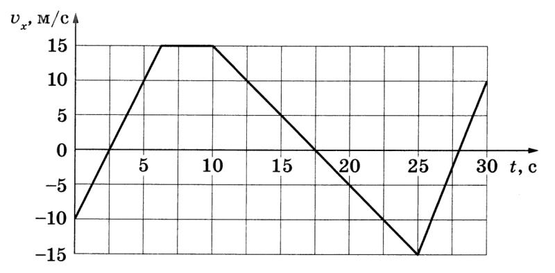 • начиная с 10 с скорость линейно убывает от +15 м/с до –15 м/с к 25 с (наклонная прямая).