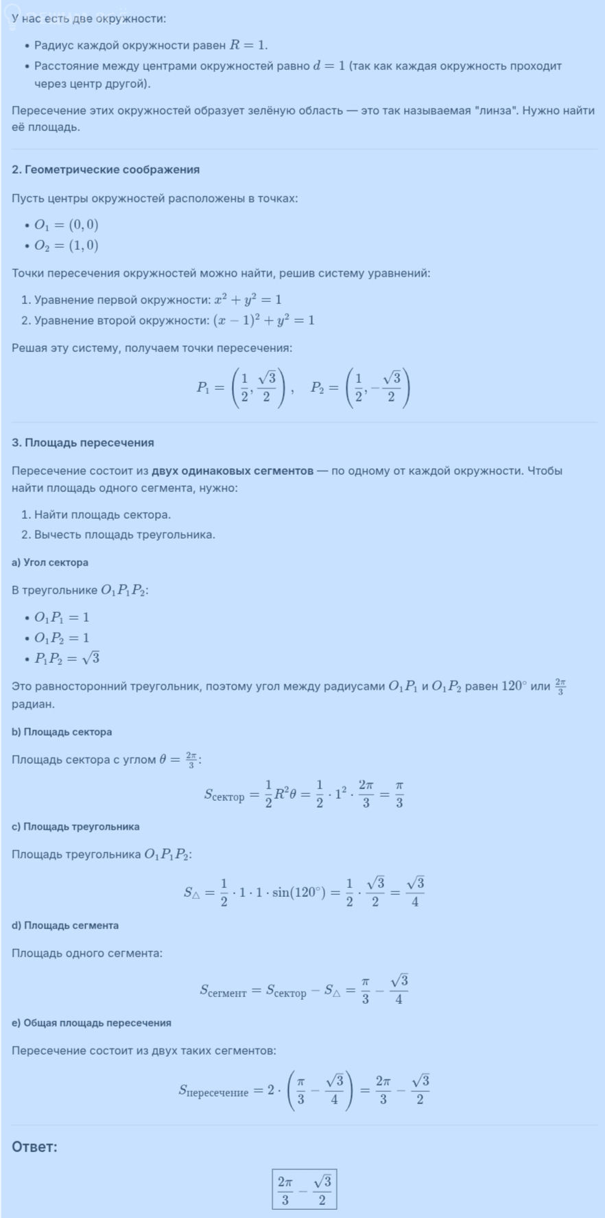 Как найти площадь их пересечения, выделенную зелёным цветом?