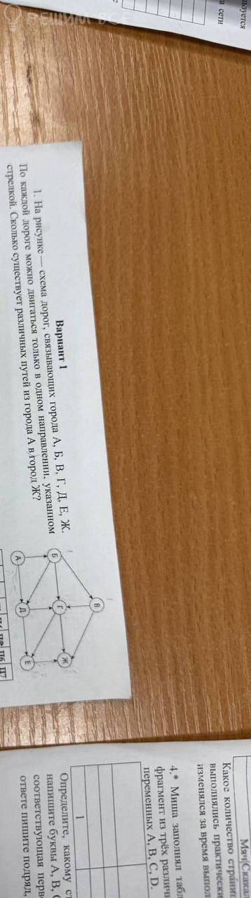 1. На рисунке — схема дорог, связывающих города А, Б, В, Г, Д, Е, Ж. По каждой дороге можно двигаться только в одном направлении, указанном стрелкой. Сколько существует различных путей из города А в город Ж?