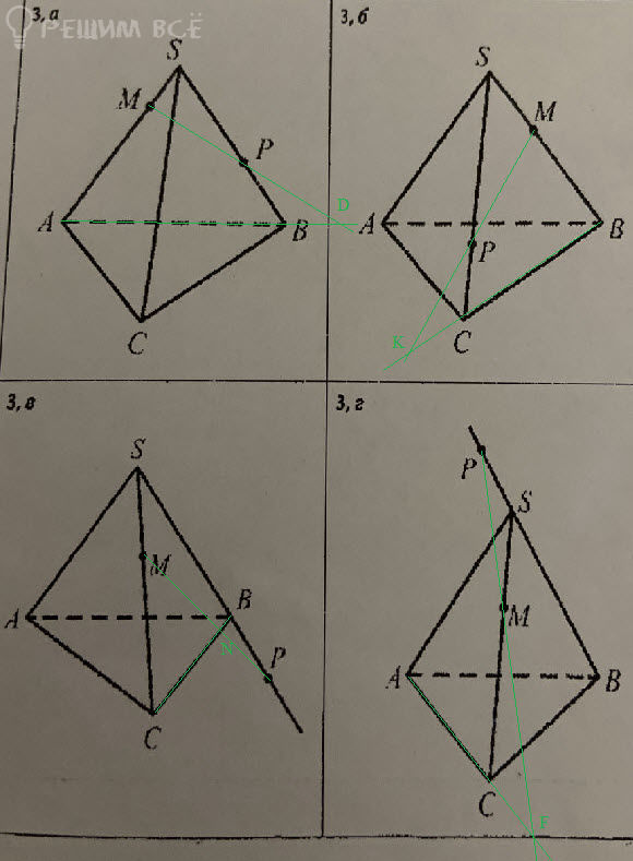 На рисунках 3, а, б, в, г изображен тетраэдр SABC. Постройте точку пересечения прямой MP с плоскостью ABC.