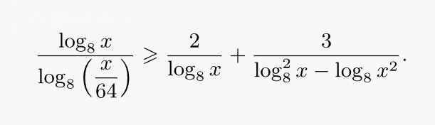 \frac{\log_{8}x}{\log_{8}\left(\frac{x}{64}\right)} \geq \frac{2}{\log_{8}x} + \frac{3}{\log_{8}^{2}x - \log_{8}x^{2}}.