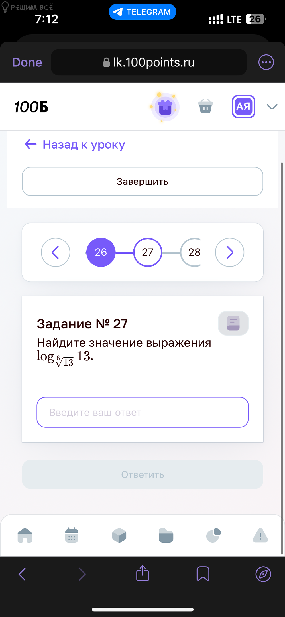 [m]log_{\sqrt[6]{13} }13=log_{13^{\frac{1}{6} }}13=6log_{13}13=log_{13}13^6=6[/m]