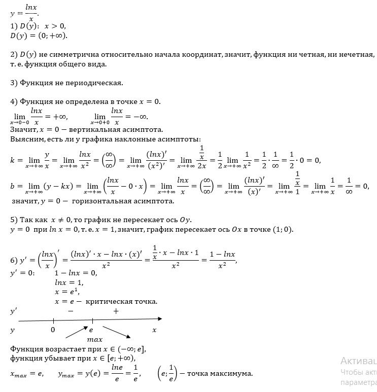 • После e убывает; до x=e^{3/2} выгнута вниз, затем, пройдя точку перегиба, убывает выгнута вверх; асимптотически стремится к нулю сверху.