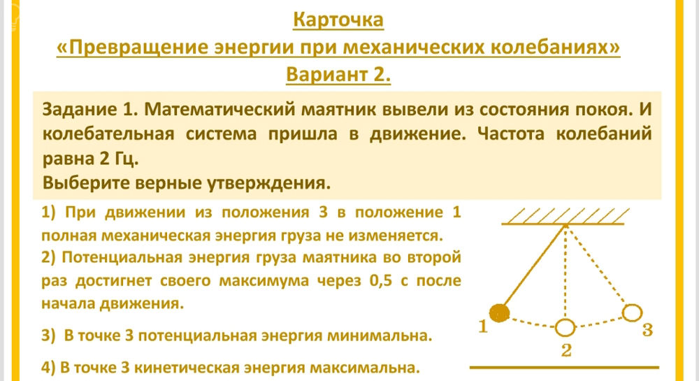 Так как частота колебаний 2 Гц, то есть 2 колебания в секунду, то через 0,5 секунды маятник вернется в положение 1, совершив полное колебание.