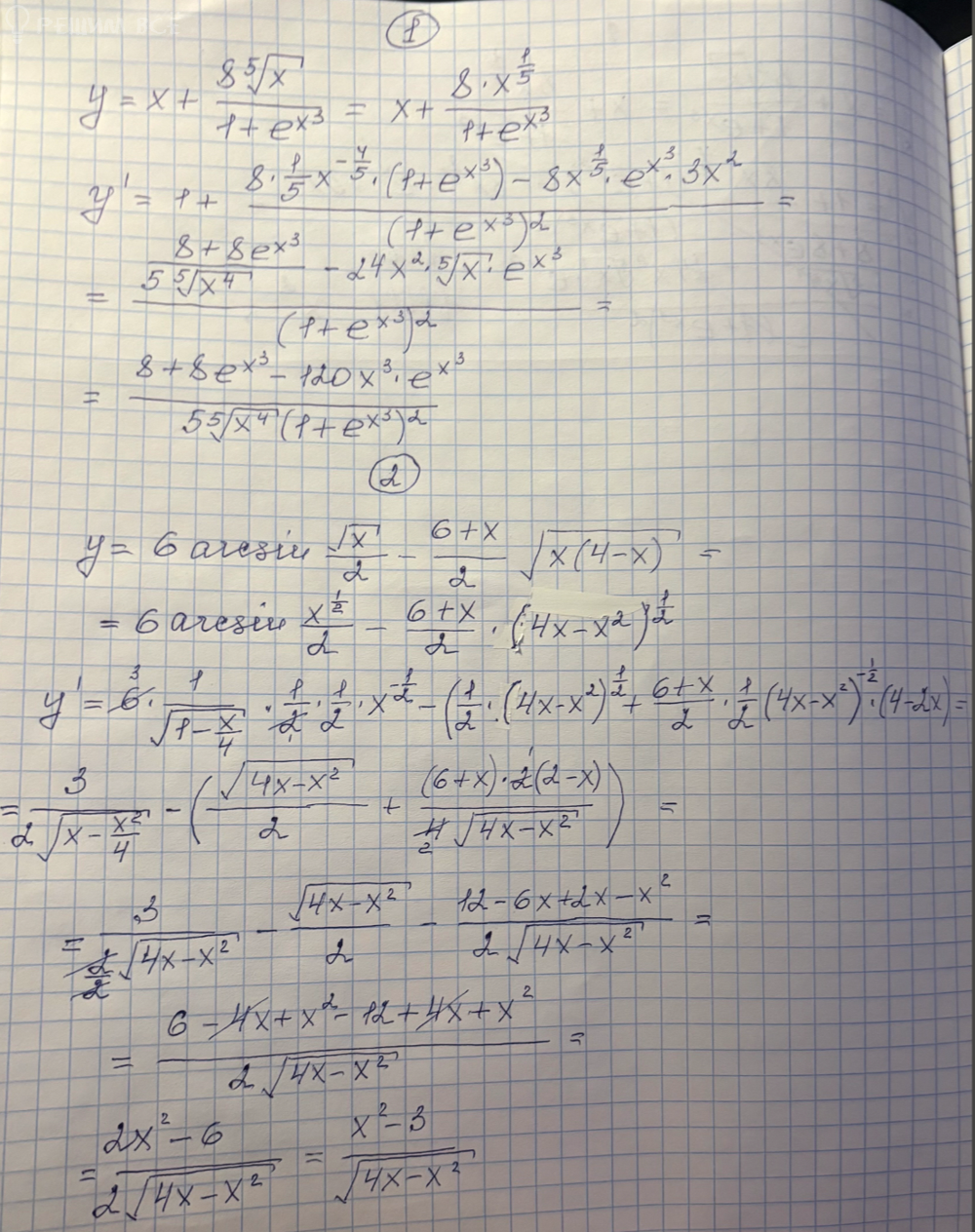 [m]\large y' = 1 + \frac{8/5 x^{-4/5}(1 + e^{x^3}) - 8x^{1/5} \cdot e^{x^3} \cdot 3x^2}{(1 + e^{x^3})^2} = [/m]